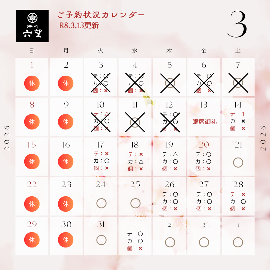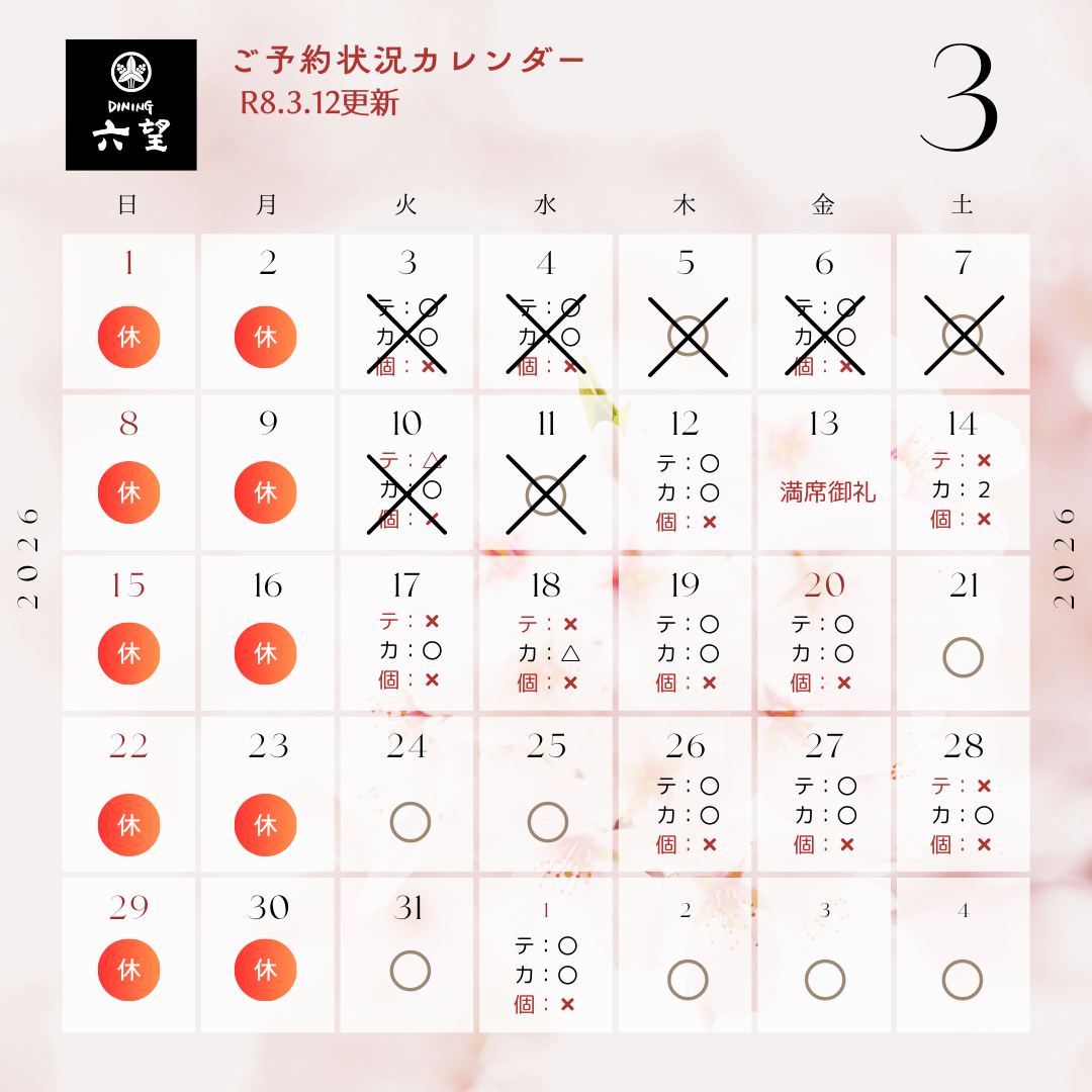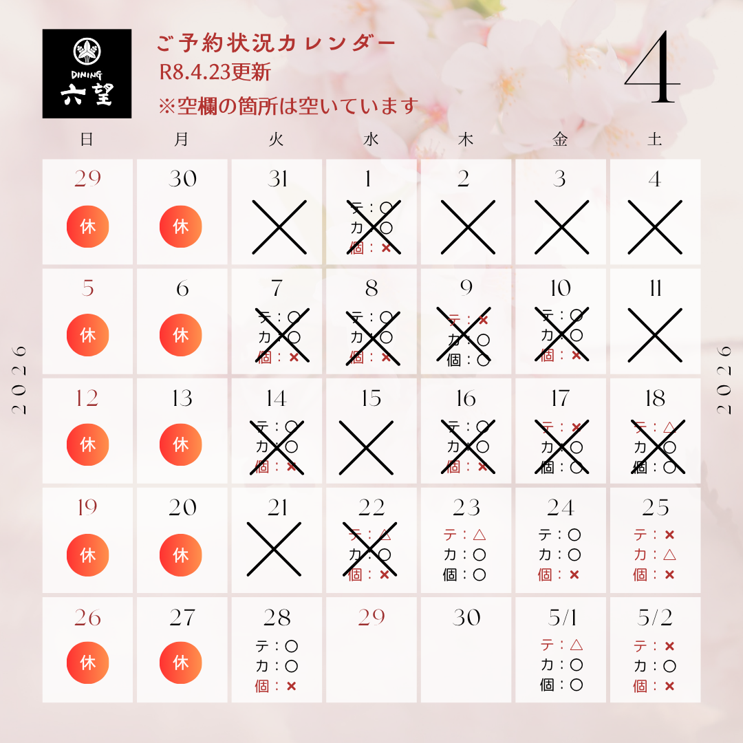 ※テ:テーブル席 カ:カウンター席 個:半個室 (△は 残1組程度)