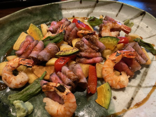 人気のローストビーフと海老のグリルを盛り合わせました。お野菜のグリルとフライドポテトなどを添えています。数名様でシェアする華やかな1皿。ローストビーフとグリルステーキをハーフハーフにすることも可能です。ご予算に応じて、人数に応じて、整えますのでご相談くださいませ。(画像は5人前)